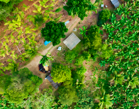 Imagem aérea mostra uma pequena propriedade rural em Jacupiranga com diversos cultivos