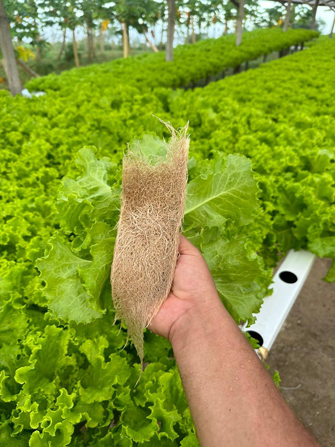 Ao antever os cenários futuros, as pesquisas da Embrapa priorizam materiais genéticos mais tolerantes ao calor. “Temos atualmente em nosso portfólio cultivares com diferentes mecanismos para resistir melhor ao calor, como a alface BRS Mediterrânea que, por ser mais precoce, fica menos dias no campo até obter um padrão comercial, ficando menos exposta às oscilações da temperatura”, esclarece Suinaga. Ele ainda destaca que o sistema radicular vigoroso da cultivar (foto abaixo) contribui para o aproveitamento de água e nutrientes do solo, indicando também uma potencial tolerância ao estresse hídrico.