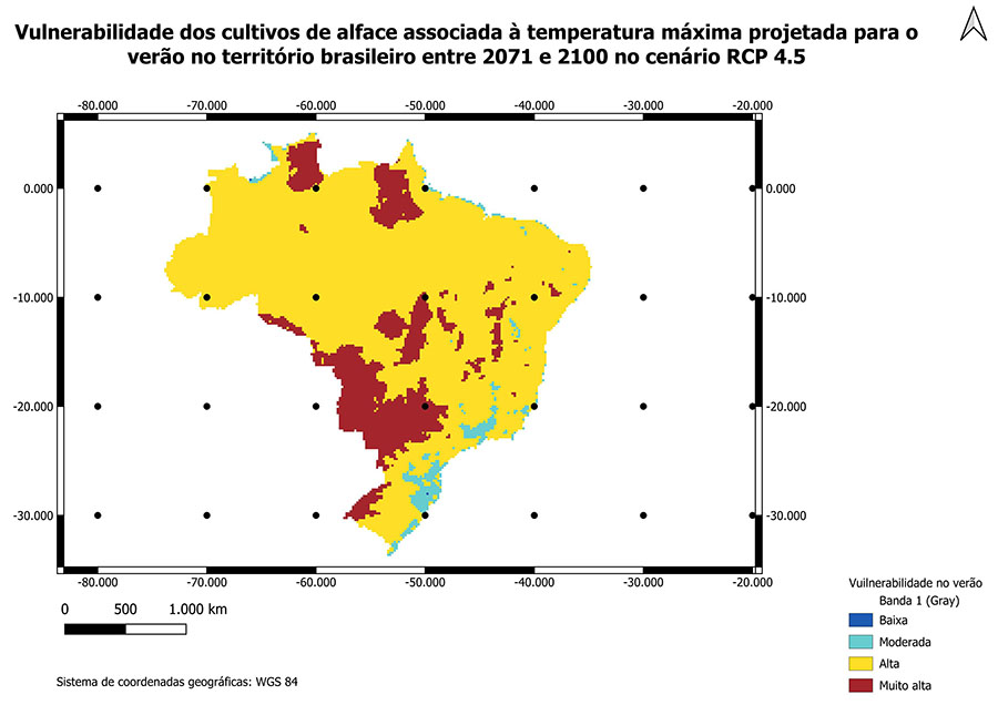 Os dados mais alarmantes aparecem nas projeções para o verão entre 2071 e 2100. No melhor cenário (RCP 4.5), 79,6% do território nacional apresenta risco climático alto para a alface em campo aberto, e 17,4% apresenta risco muito alto. Já no pior cenário (RCP 8.5), 87,7% do território entra na categoria de risco muito alto, e apenas 11,8% permanece com risco alto.